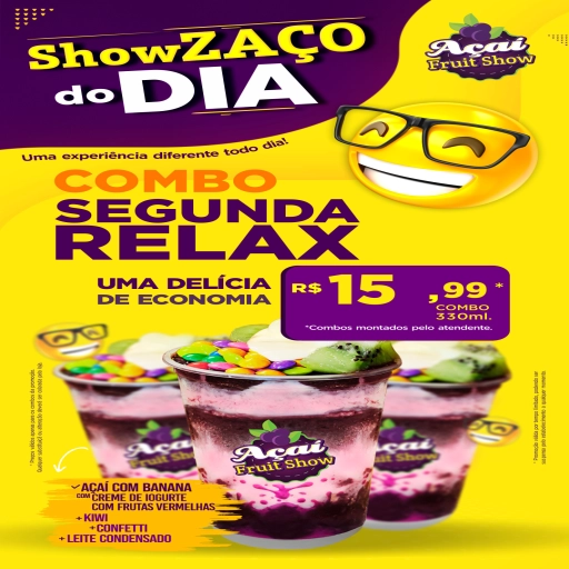 Um copo de 330ml com Açaí natural + Creme de Graviola + kiwi + Granola + Leite em Pó + Leite Condensado.